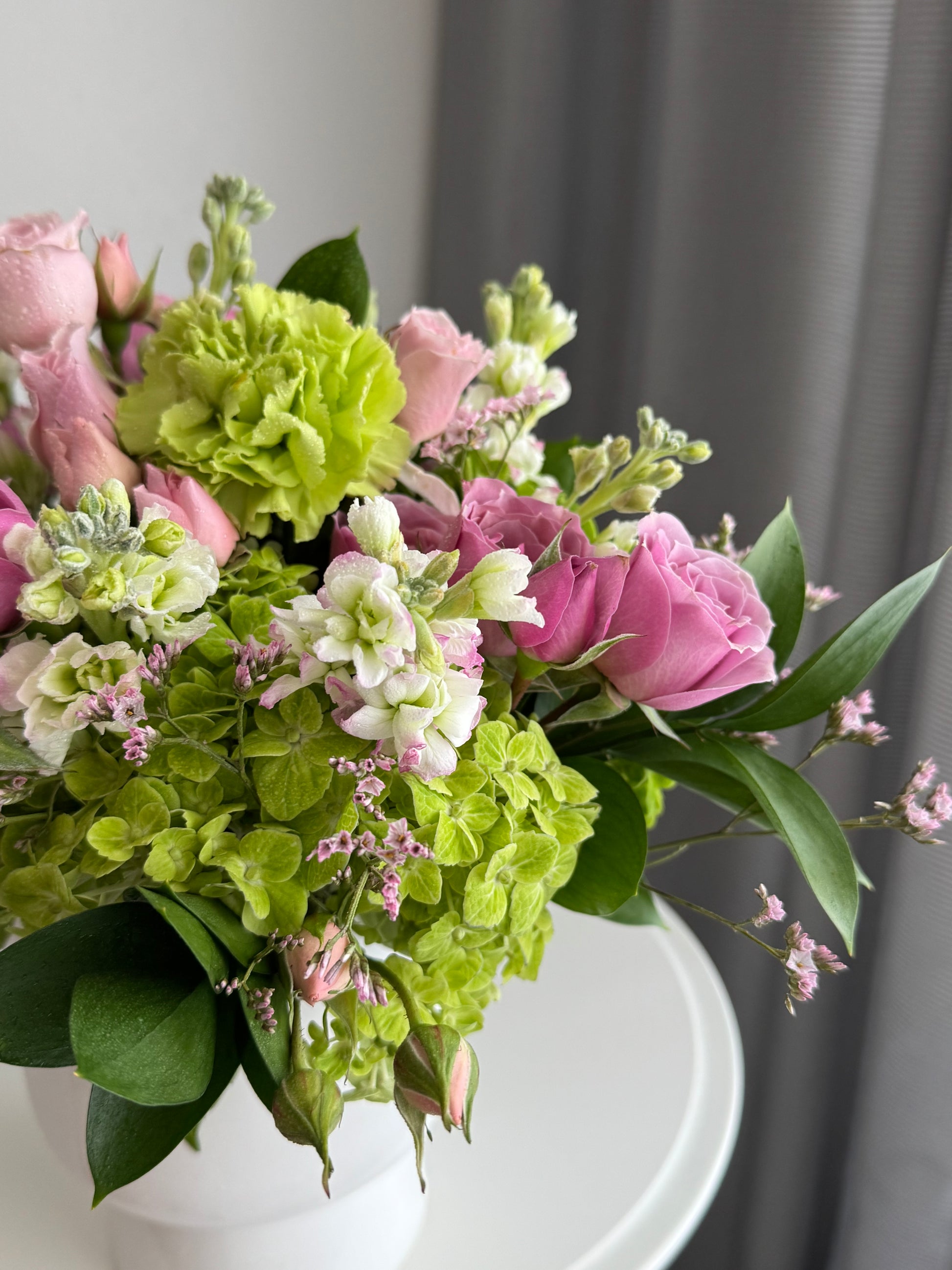 Delicate and refined — this ceramic arrangement features green hydrangeas, pink spray roses, and fragrant stock.