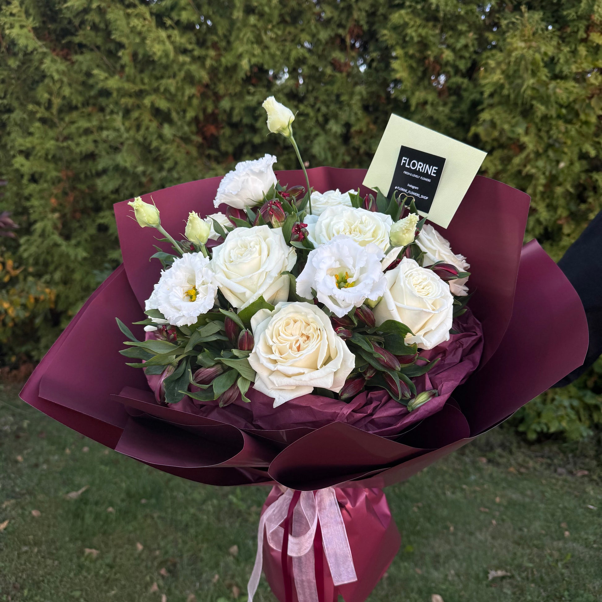 A refined bouquet featuring creamy white roses, delicate lisianthus, and deep burgundy alstroemeria.
